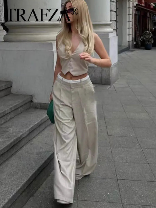 Women's TRAFZA Suit™ Asymmetric Sleeveless Single Breasted Top + High Waist Loose Trousers