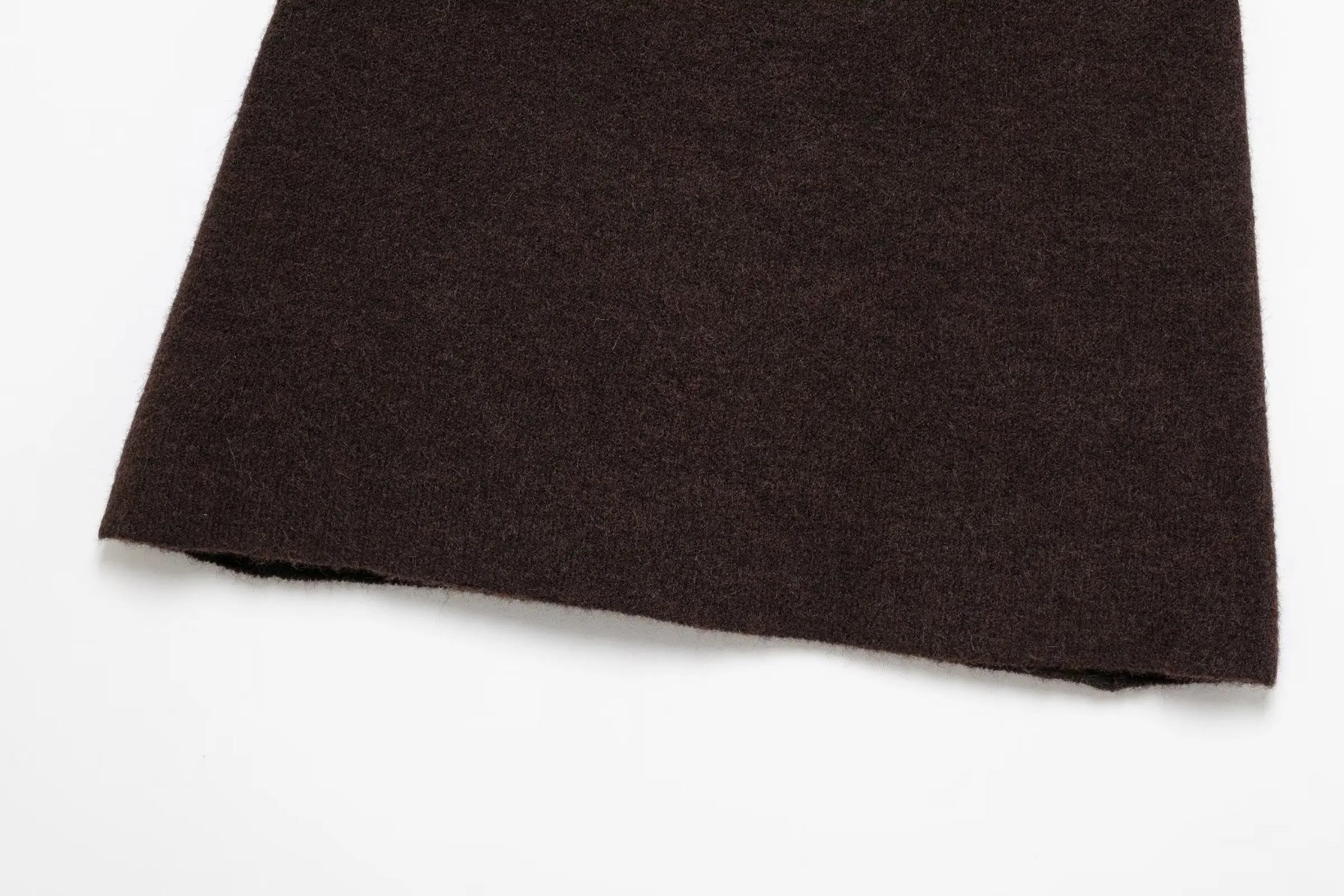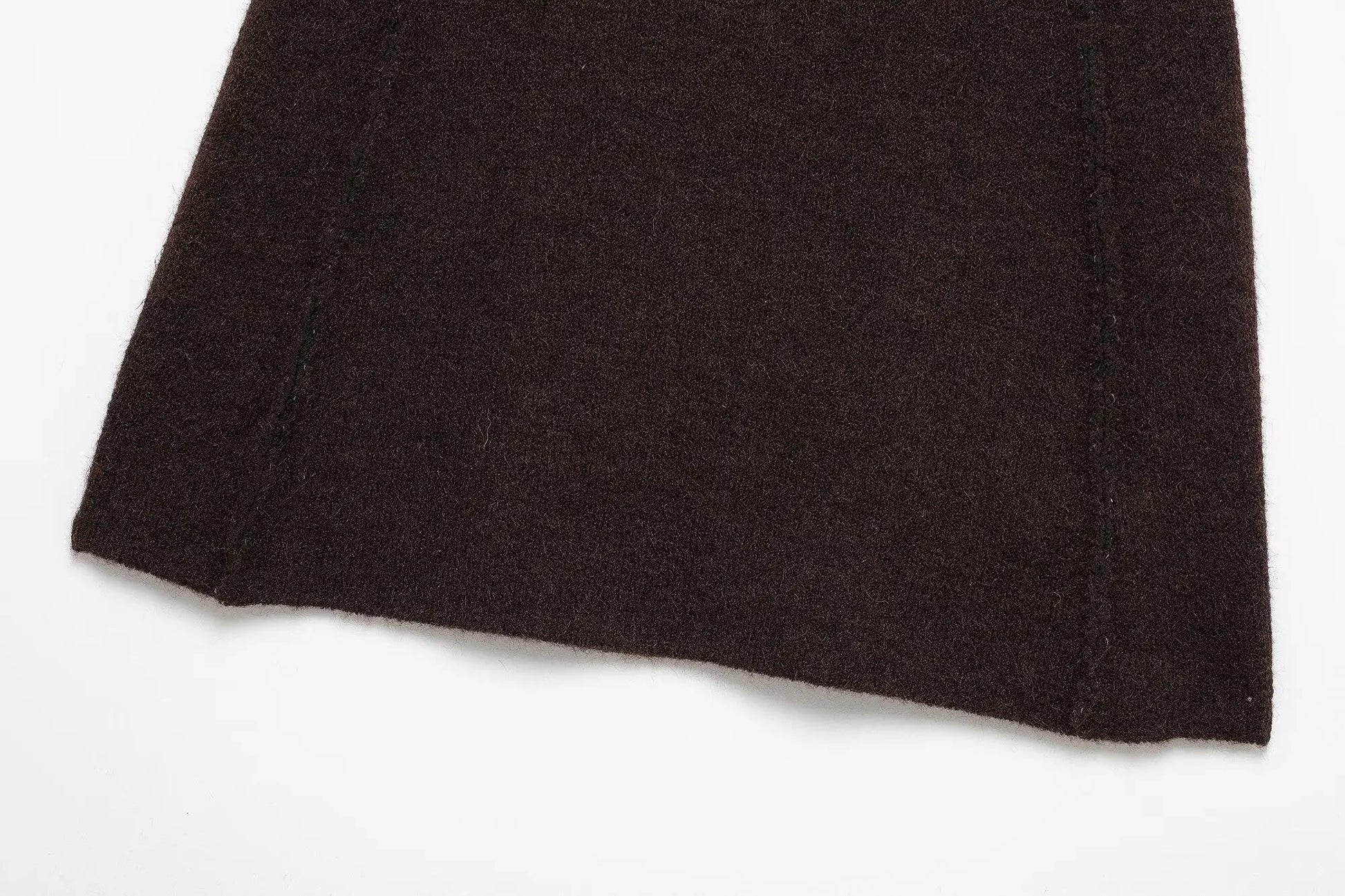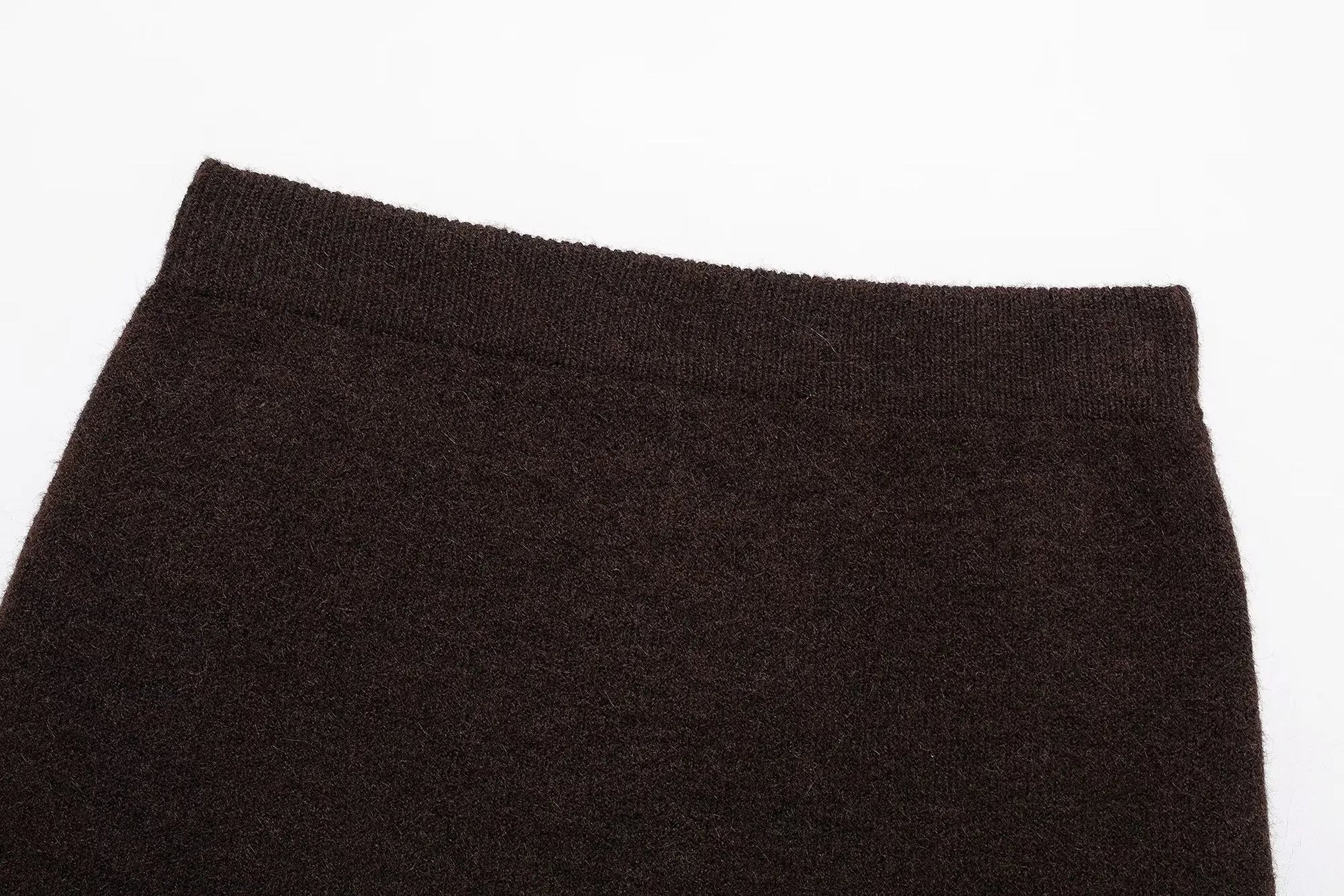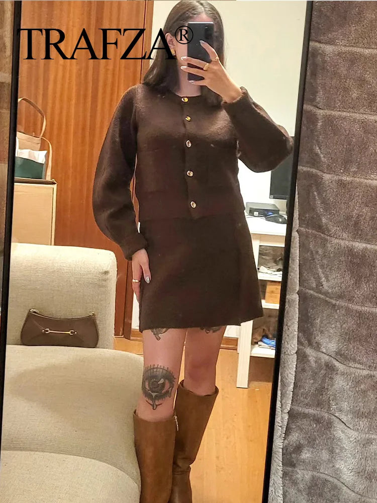 TRAFZA Women's Knitted Brown Suit™ Buttons Pocket Cardigan Sweater and Elastic Waist Slim Mini Skirt