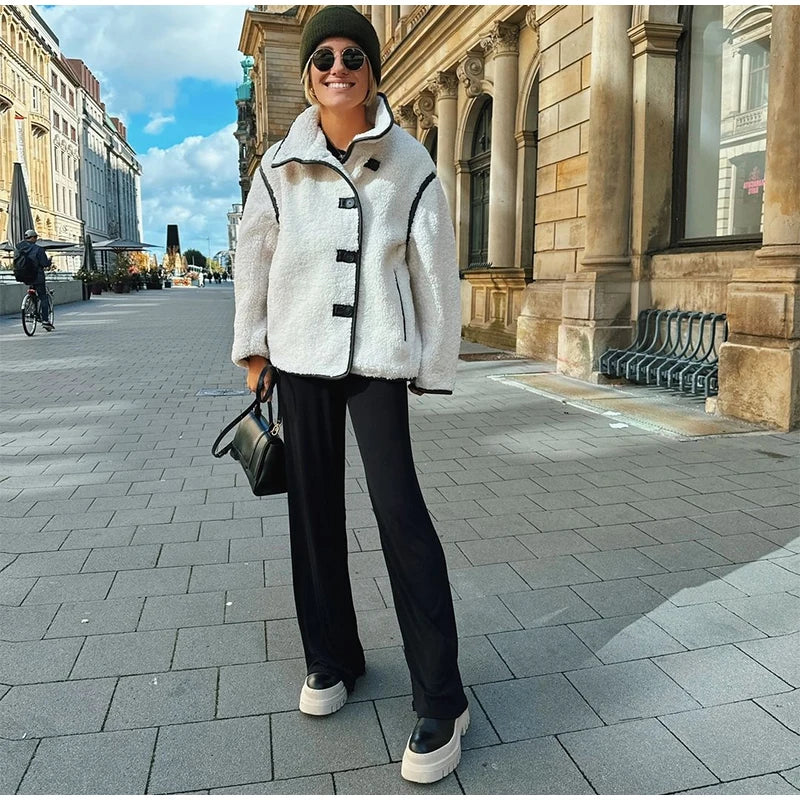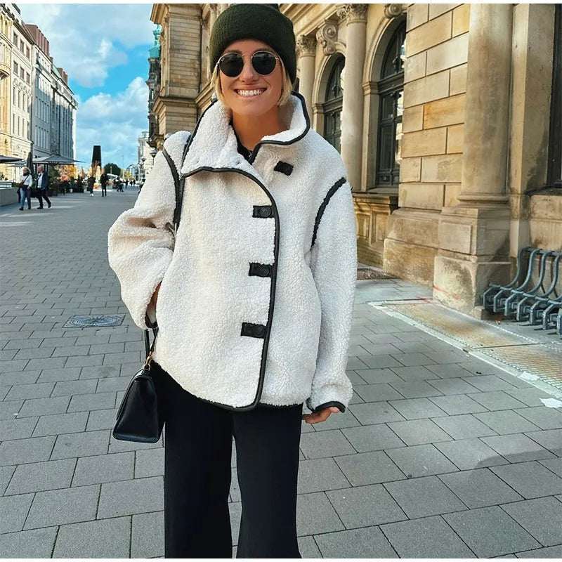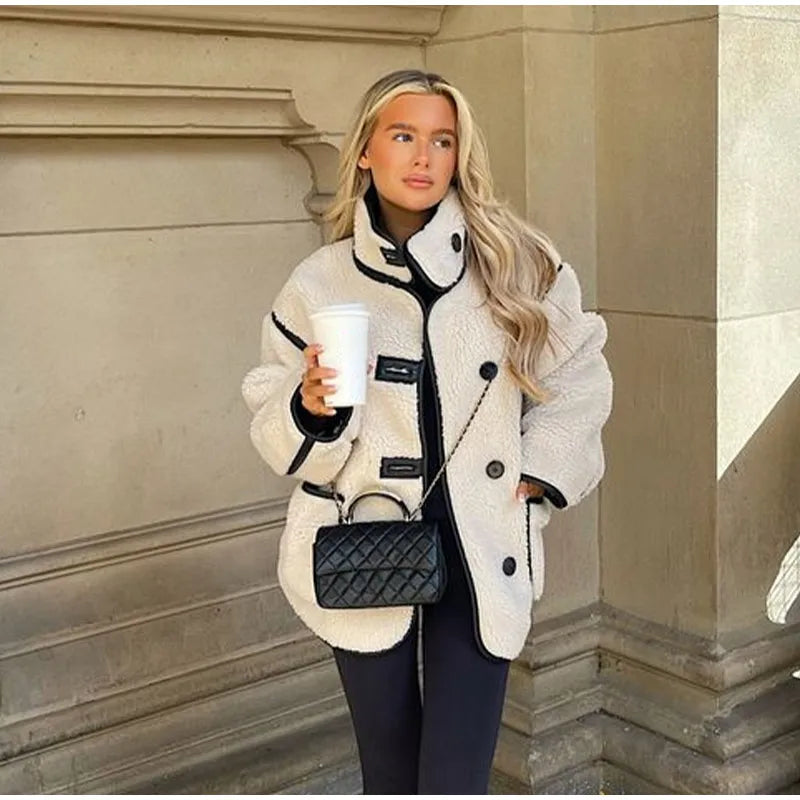 Woman's Contrast Fleece Jackets™ Thick Warm Stand Single Breasted Pockets Long Sleeve Outerwear