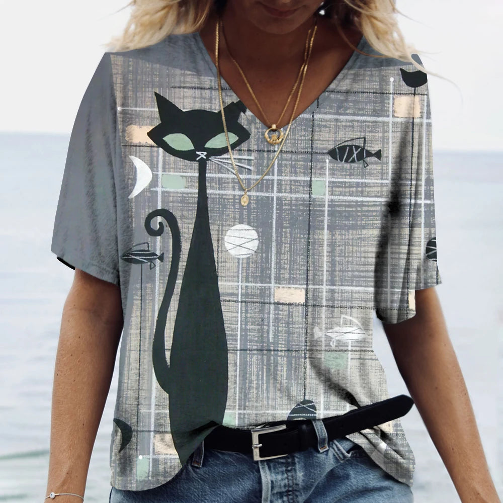 Women's Cartoon Cat Print T-shirt™ Summer Short Sleeve V-Neck Kawaii Fashion Tees