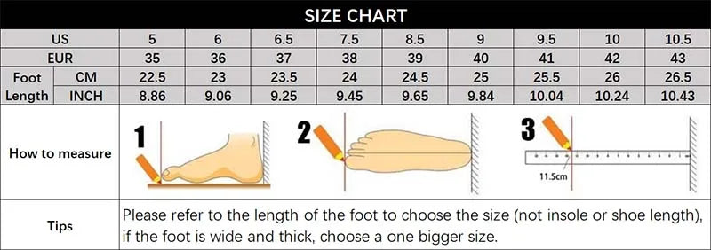 Please choose the size according to foot length, due to different Countries have different size, so our size is just for reference choose not standard US or EUR size and please measure the foot length correctly.