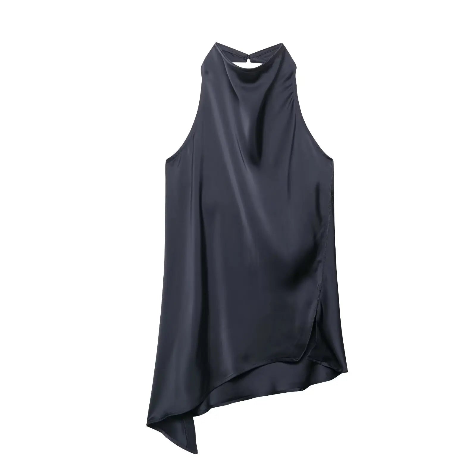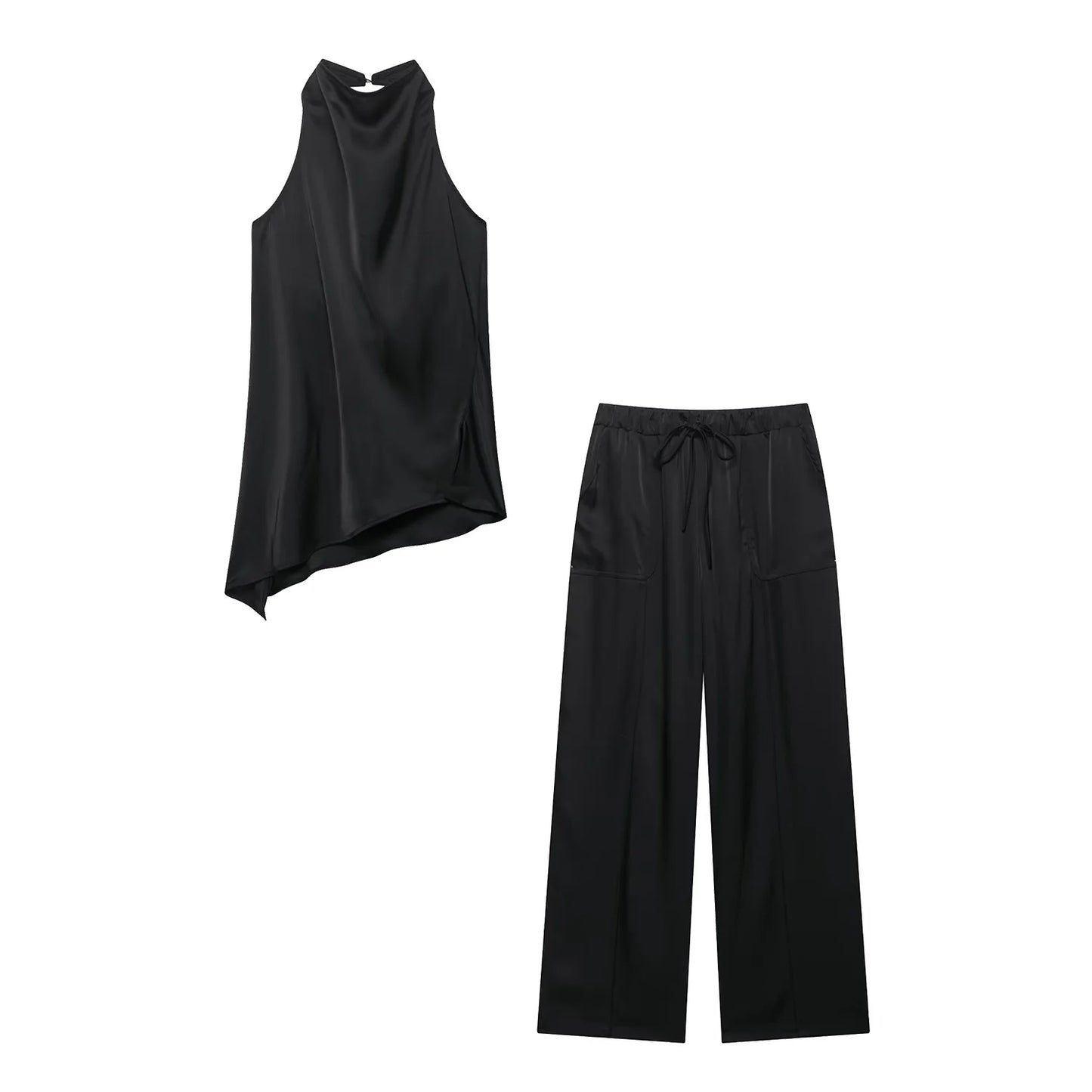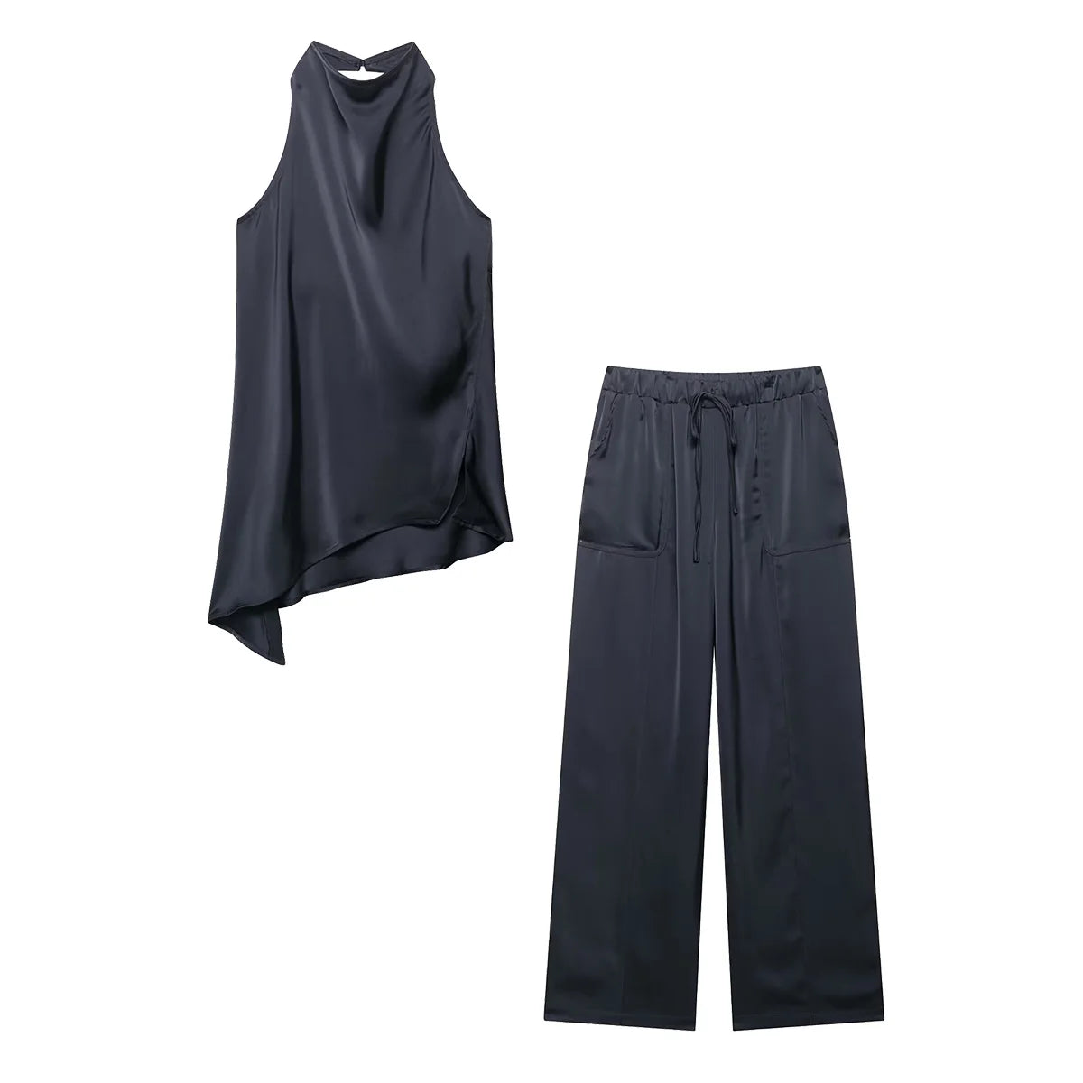 Women's Suit Set™ EDSA Asymmetric Hem Open Back Halter Neck Blouse Mid-rise Straight Long Trousers Suits