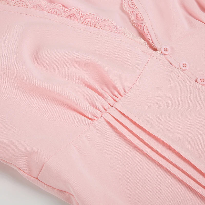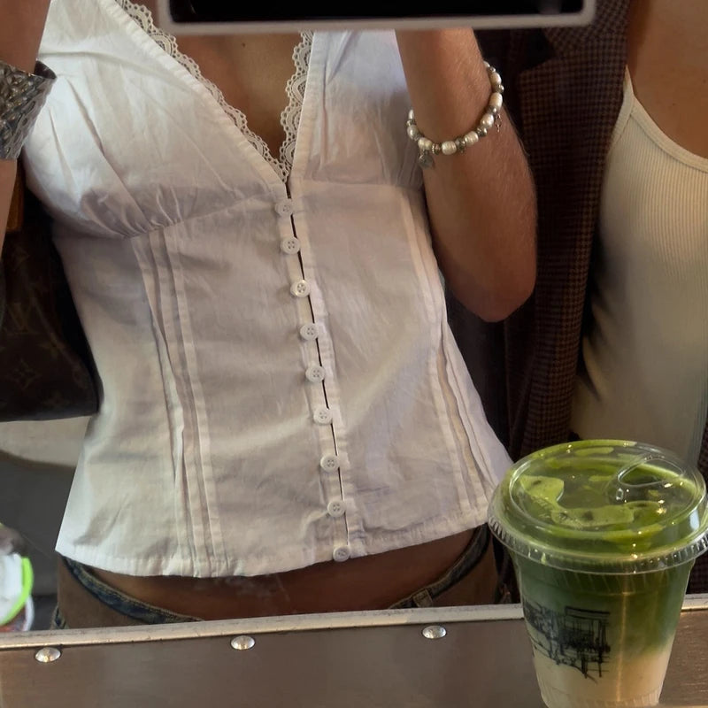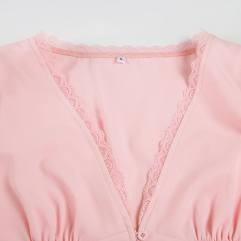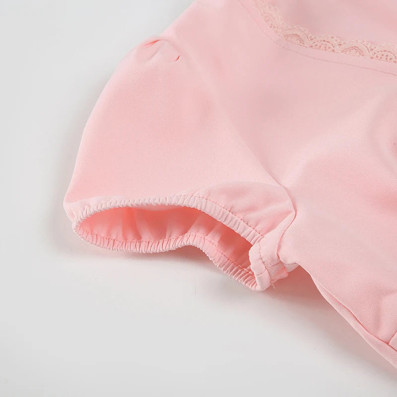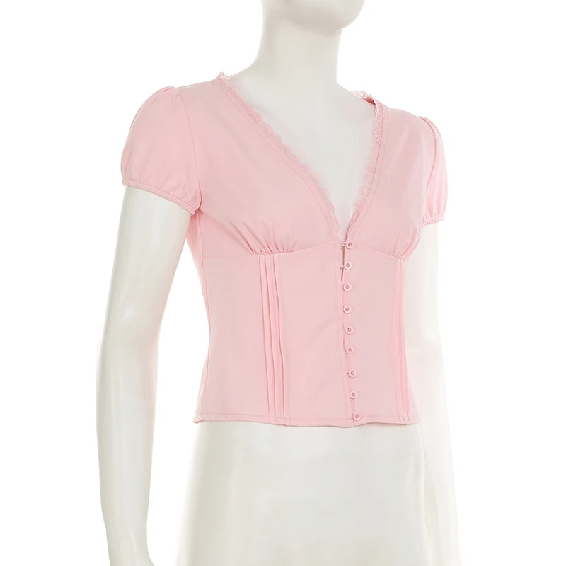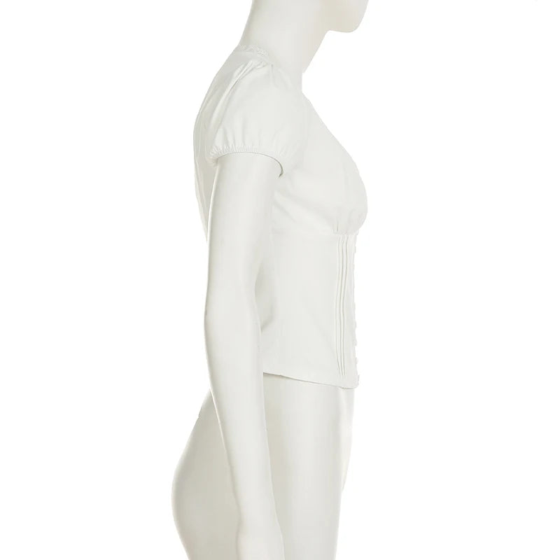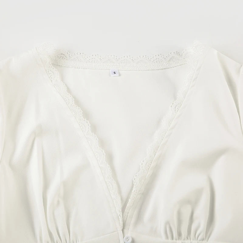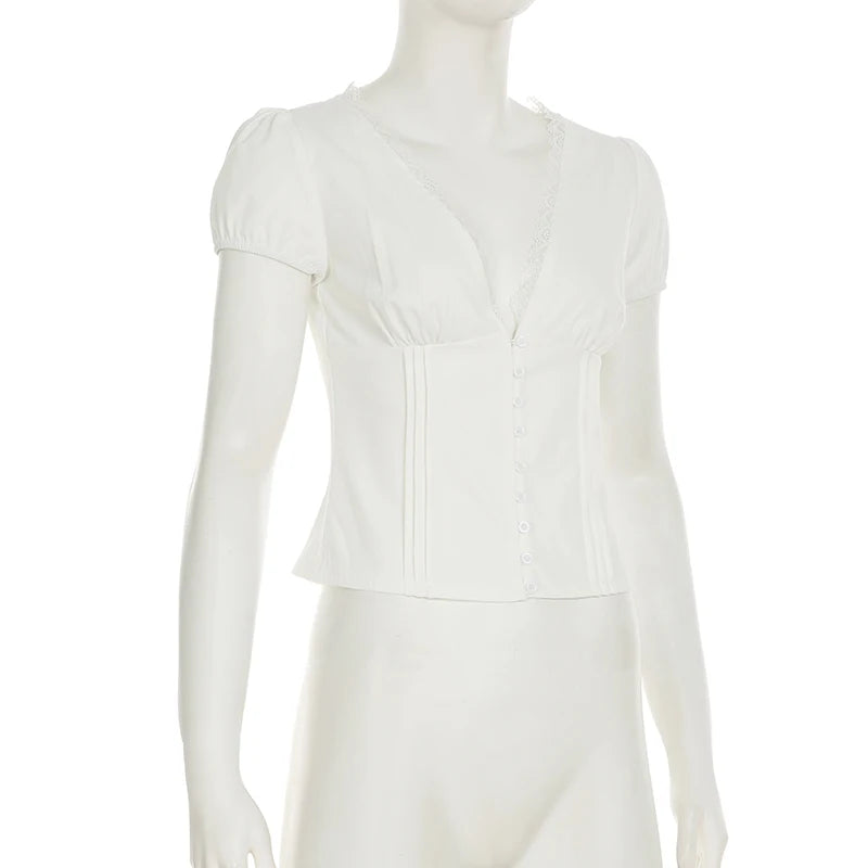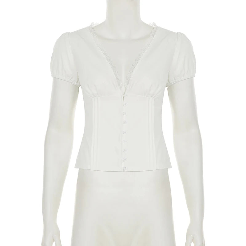 Women's Summer T-Shirt™ V-neck Lace Patchwork French Style Puff Sleeve White Blouse Y2K Aesthetics Cute Tops
